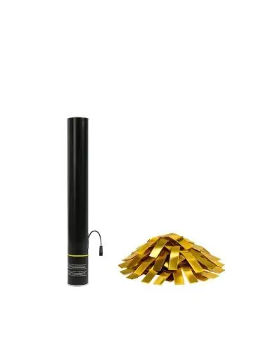 Cañón de confeti eléctrico de 50 cm. precargado para el lanzamiento del mismo, para el cual es necesario un disparador que le aporte el voltaje necesario. El confeti precargado está disponible tanto en papel (con una caída más lenta para que permanezca más en el aire) como metalizado (cae más rápido pero el efecto visual es precioso) y en diferentes colores.