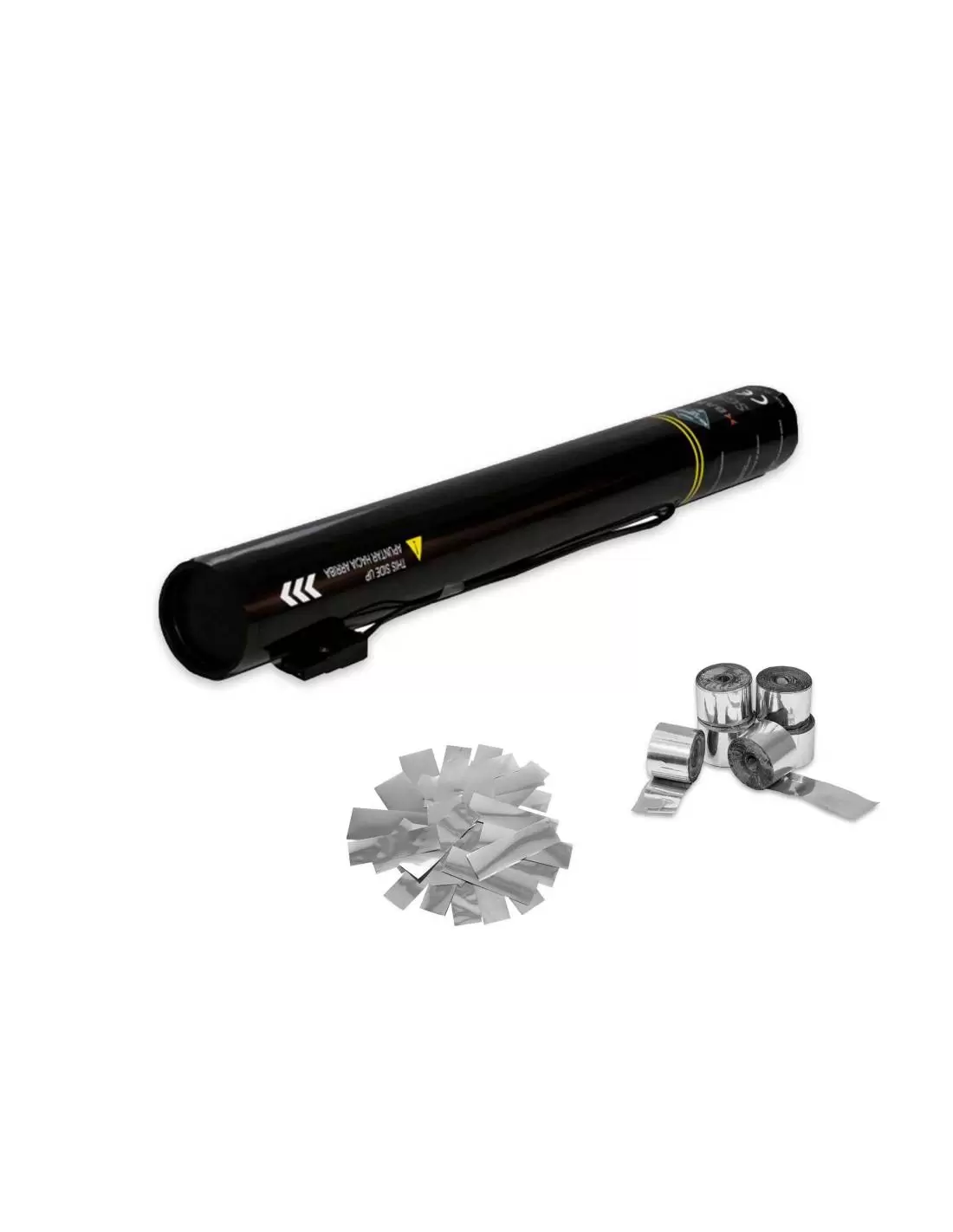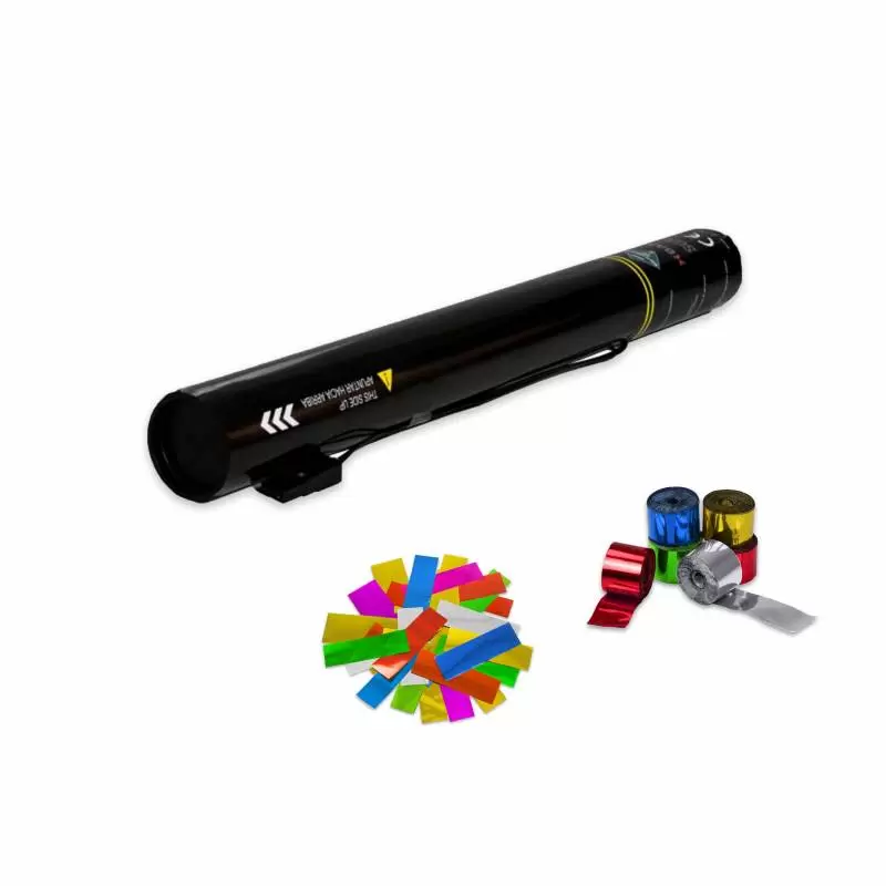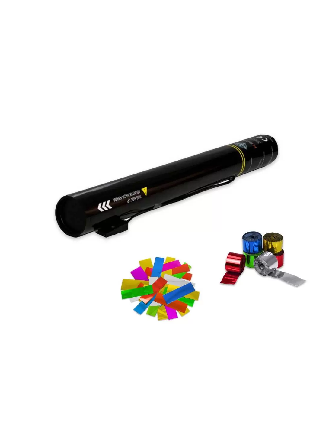 Cañón de confeti eléctrico de 50 cm. de largo, con confeti rectangular brillo + serpentinas brillo de 0,85 cm. de ancho x 5 metros de largo. Se requiere un disparador eléctrico para el funcionamiento del lanzador.