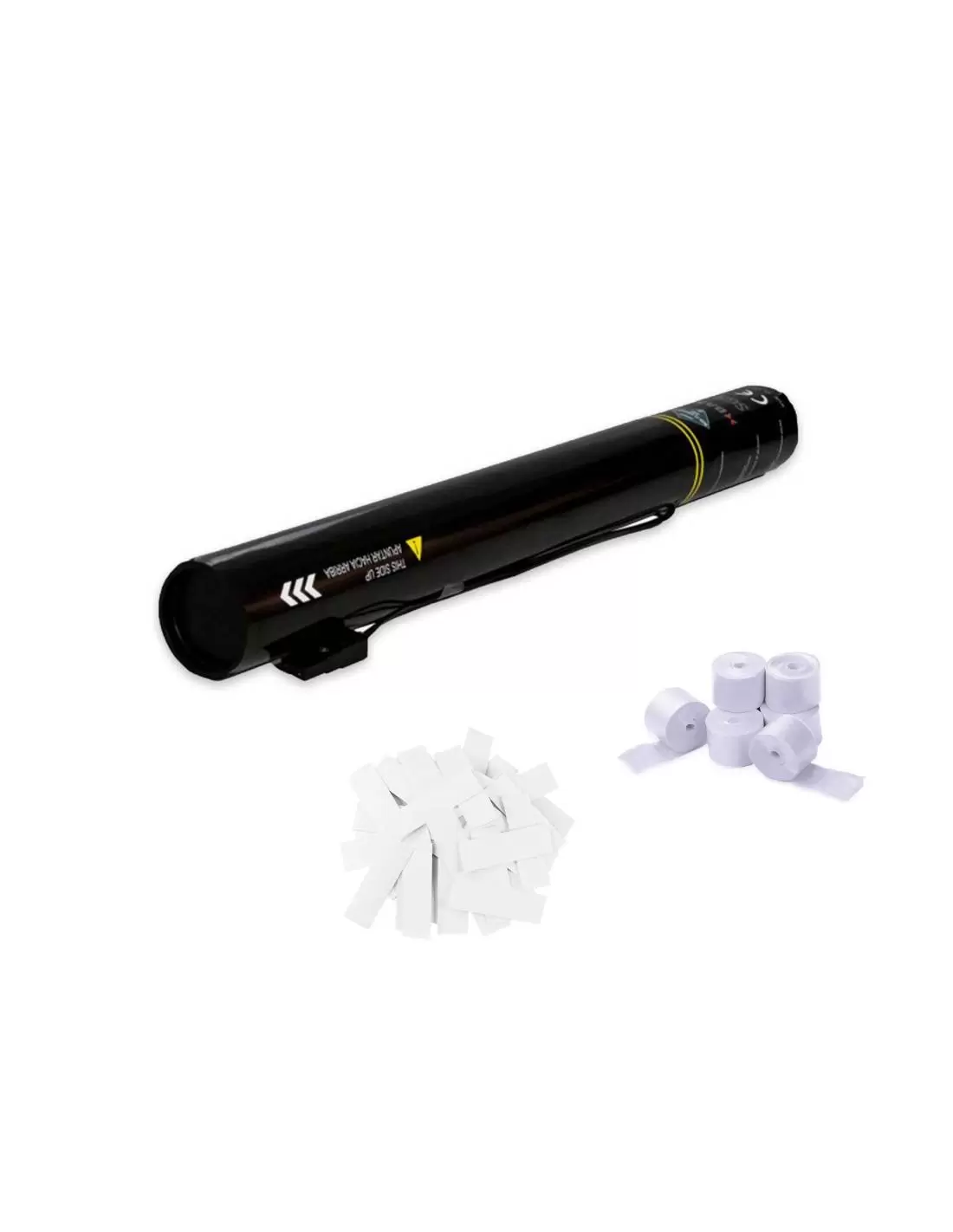 Cañón eléctrico de 50 cm. de largo, con confeti rectangular papel + serpentinas papel de 0,85 cm. de ancho x 5 metros de largo. Se requiere un disparador eléctrico para el funcionamiento del lanzador.