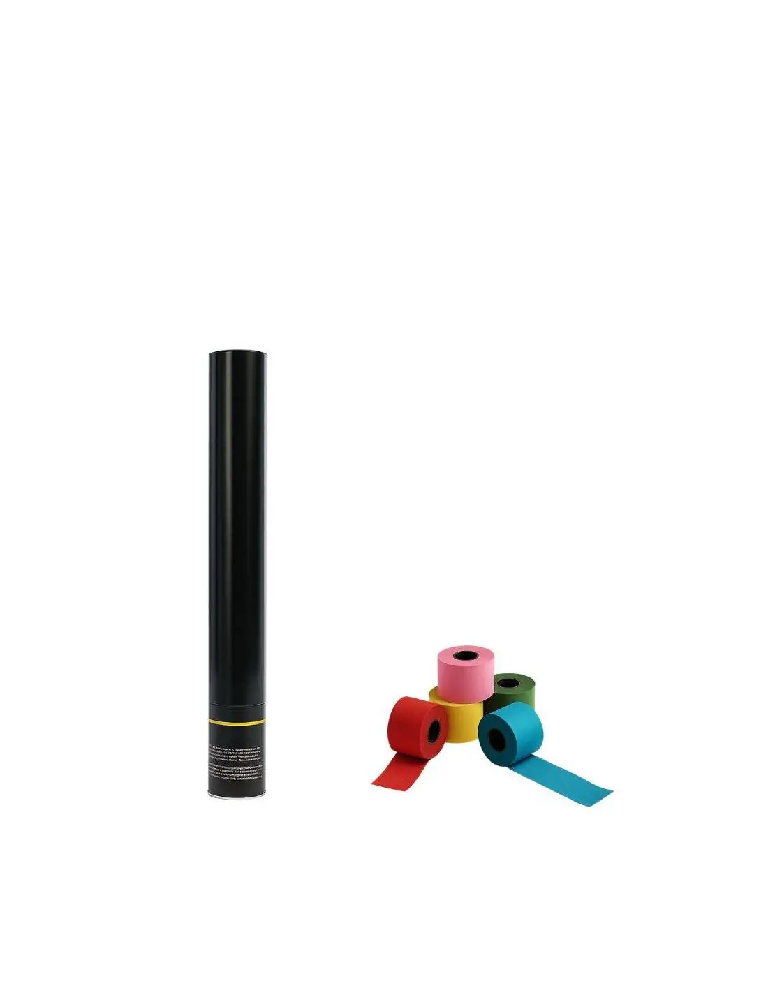 Cañón manual de 50 cm. con serpentinas papel BIO de 0,85 cm. de ancho x 5 metros de largo. Se acciona de forma manual girando la parte inferior del tubo.