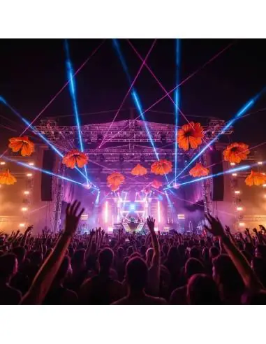 Flores confeccionados con tela 420D Oxford blanca. Los colores de luz LED son blanco, verde, rojo, azul, amarillo, naranja, morado en diferentes tonos y intensidades. Se puede colgar en Truss o anclar al suelo. Funcionan directamente a corriente.