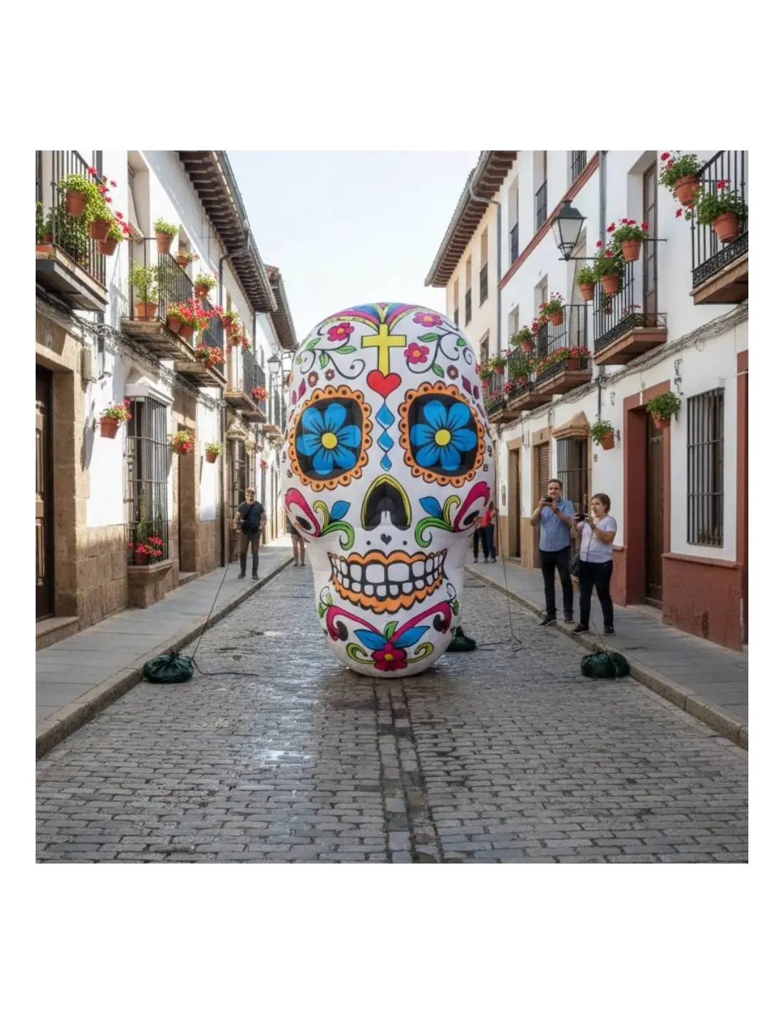 Figura hinchable LED con forma de calavera mexicana, ideal para decorar espacios, fiestas temáticas, carrozas o eventos. Su diseño inspirado en el Día de los Muertos y su iluminación LED interna crean un efecto visual colorido y llamativo, destacando tanto de día como de noche.