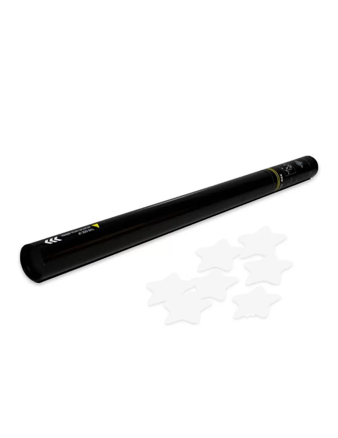 Cañón manual de 80 cm. cargado con confeti en forma de estrellas. Se acciona de forma manual girando la parte inferior del tubo.