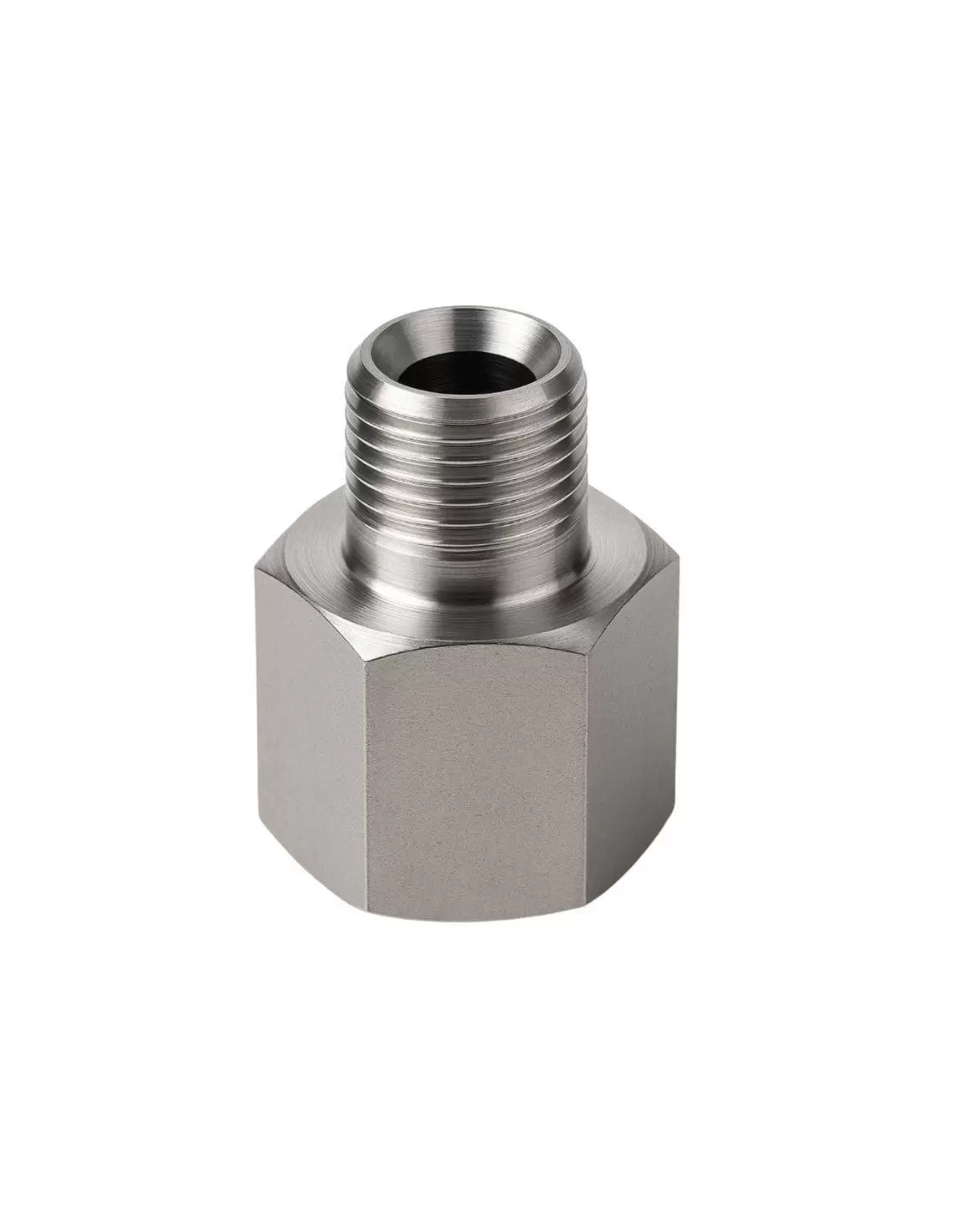 Adaptador de acero inoxidable. Ideal para conectar tuberías o mangueras con diferentes tamaños o tipos de rosca.