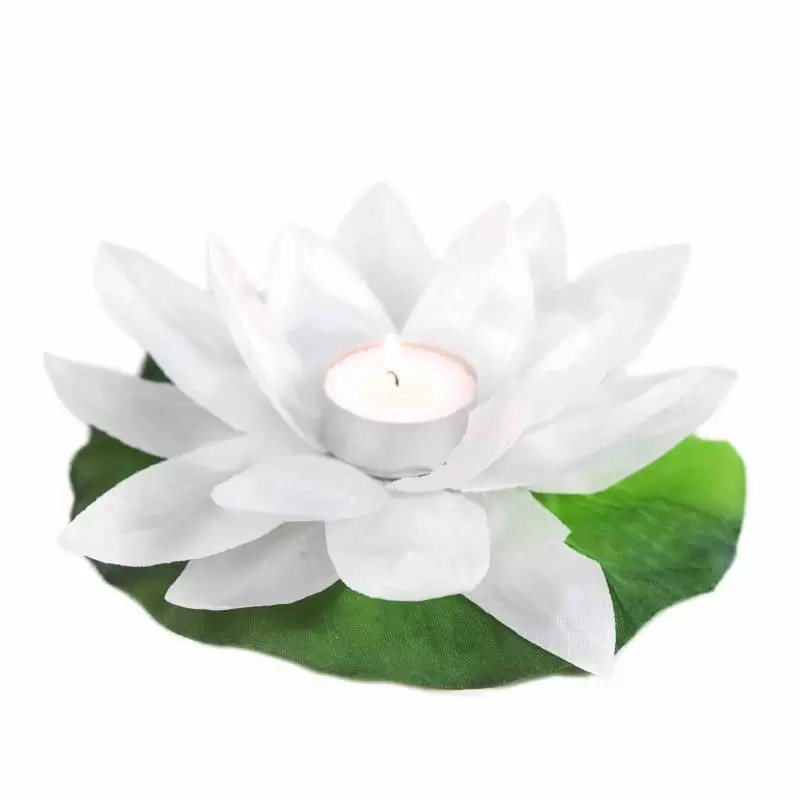 Velas decorativas para interior o exterior. Este nenúfar de poliéster está disponible en cinco colores y es reutilizable. Incluye velas de té.