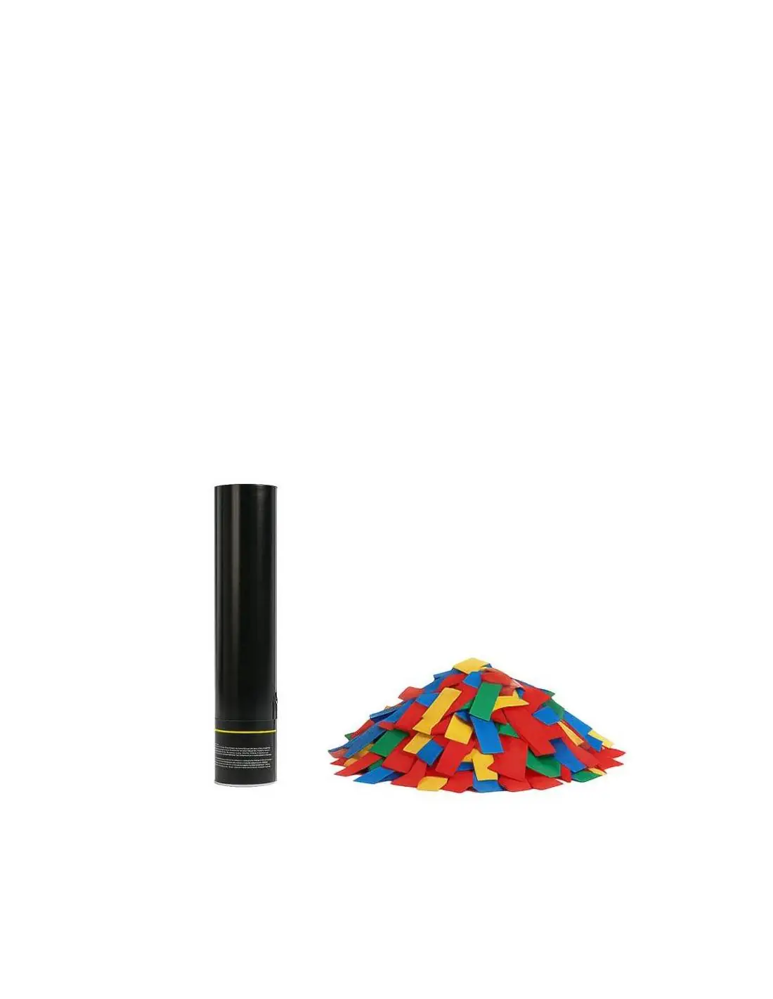 Les confettis inclus peuvent être en papier ou métallisés, d'une taille de 2 cm de large et de 5 cm de long et pouvez choisir parmi une large gamme de couleurs. Il est actionné manuellement en tournant le bas du tube.