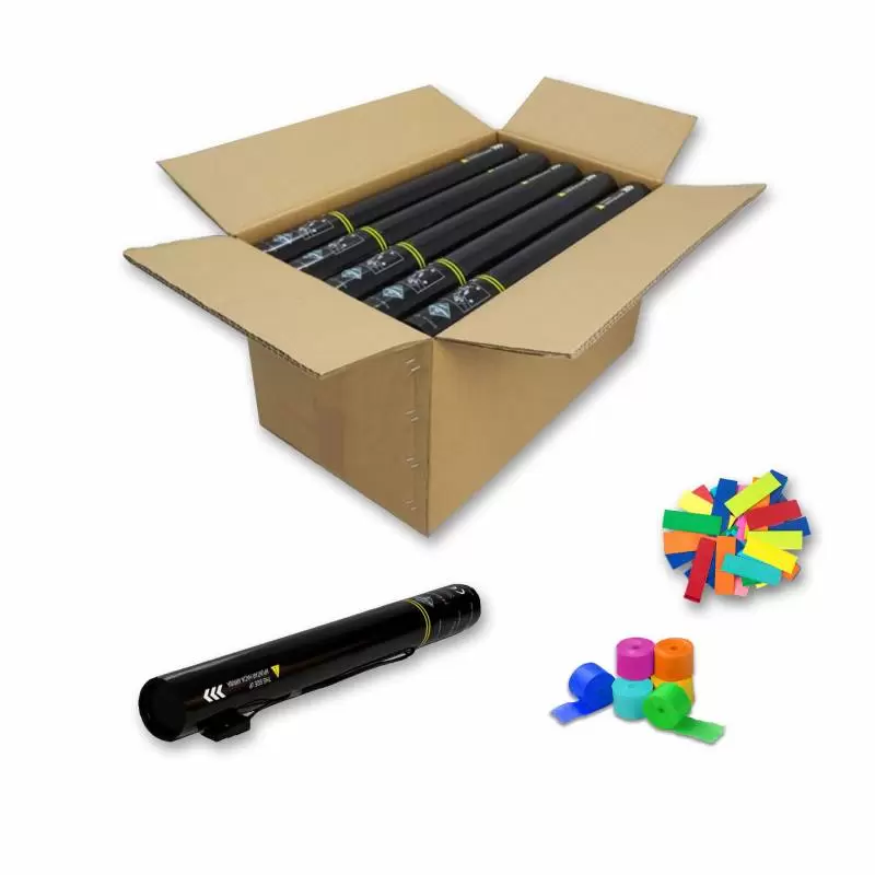 Pack de 20 canons électriques 50 cm. de long, avec des confettis en papier rectangulaires + des banderoles en papier de 0,85 cm. de large x 5 mètres de long. Une machine électrique est requis pour le fonctionnement du lanceur.