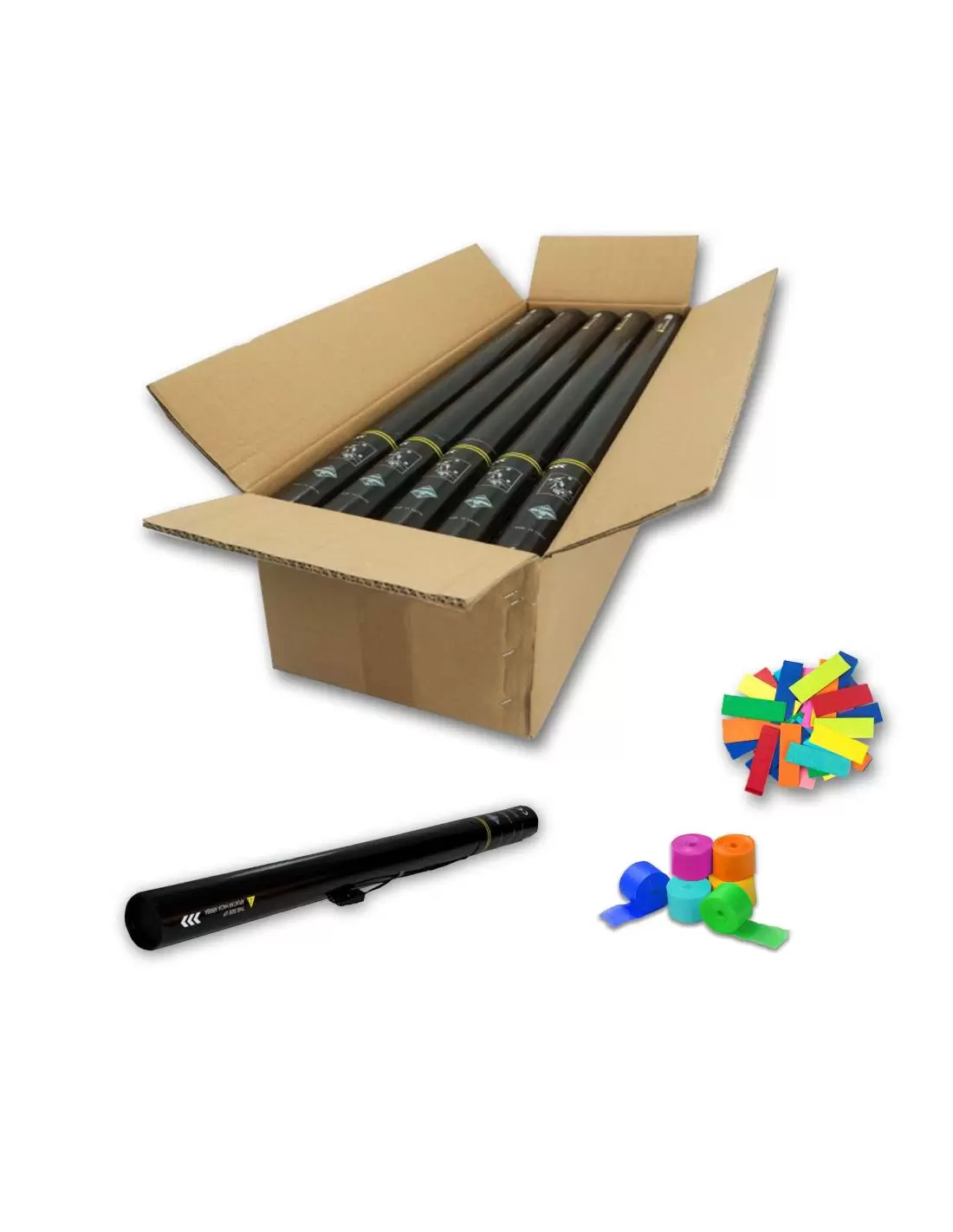 Pack de 20 canons électriques 80 cm. de long, avec des confettis en papier rectangulaires + des banderoles en papier de 1,5 cm. de large x 10 mètres de long. Une machine électrique est requis pour le fonctionnement du lanceur.