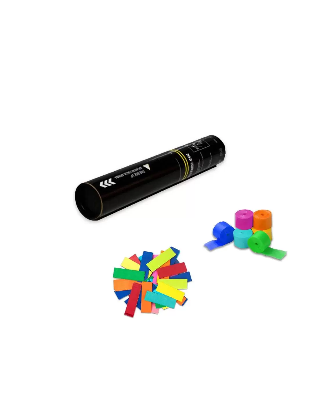 Canon à confettis manuel 30 cm. de long, avec des confettis en papier rectangulaires + des banderoles en papier de 0,85 cm. de large x 5 mètres de long. Il est actionné manuellement en tournant le bas du tube.