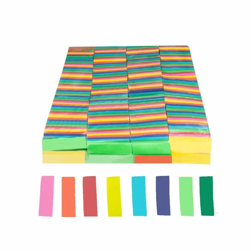La chute des confettis rectangulaires est très lente, car le matériau en papier de soie pèse très peu. En tant que caractéristiques de sécurité importantes, il s'agit d'un matériau professionnel car il est 100% ignifuge. C'est quelque chose à garder à l'esprit pour des raisons de sécurité.