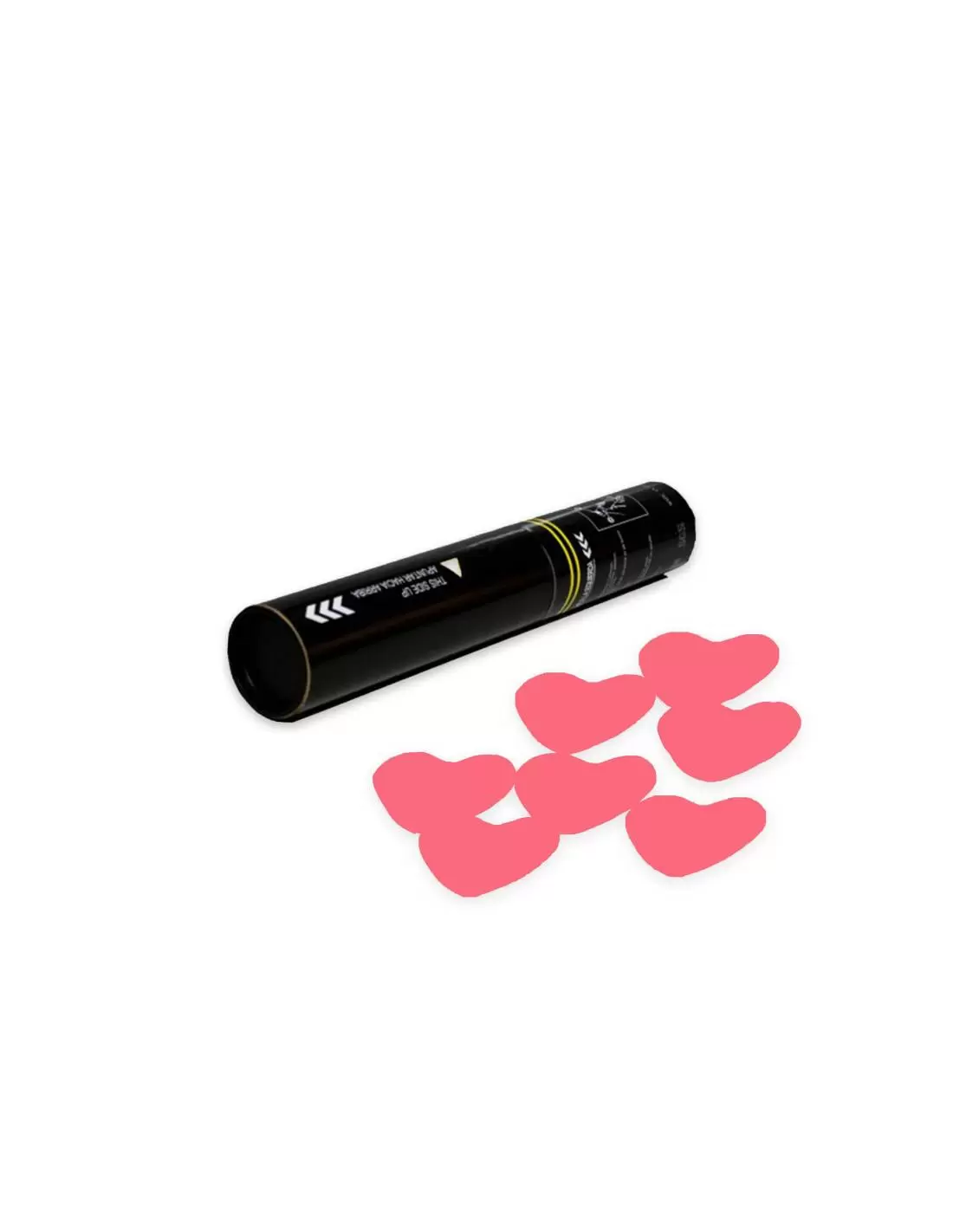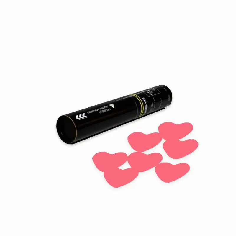 Canon manuel de 30 cm. chargé de confettis en forme de coeurs. Il est actionné manuellement en tournant le bas du tube.