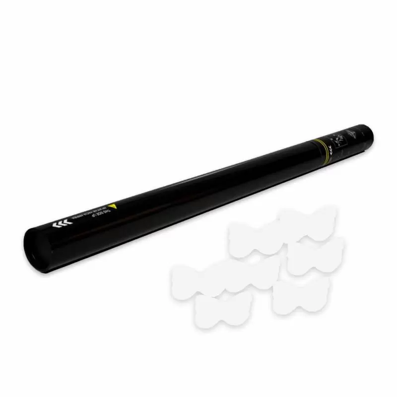 Canon manuel de 80 cm. chargé de confettis en forme de papillons. Il est actionné manuellement en tournant le bas du tube.