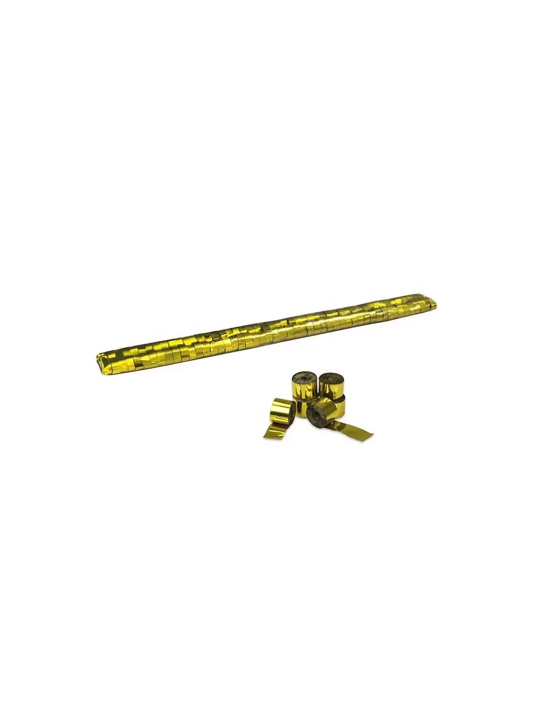 Une bande de 80 banderoles de 5 mètres par 1 cm de large est incluse, conçue pour être lancée dans des canons vides (manuels ou électriques) ou dans des machines. Ils sont ignifuges et sont disponibles dans les couleurs argent, or et multicolore métallique.