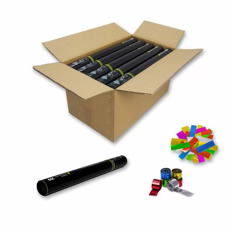 Pack of 20 handheld cannons of 50 cm. with rectangular metallic confetti + 0,85 cm metallic streamers. wide x 5 meters long. It is operated manually by turning the bottom of the tube.