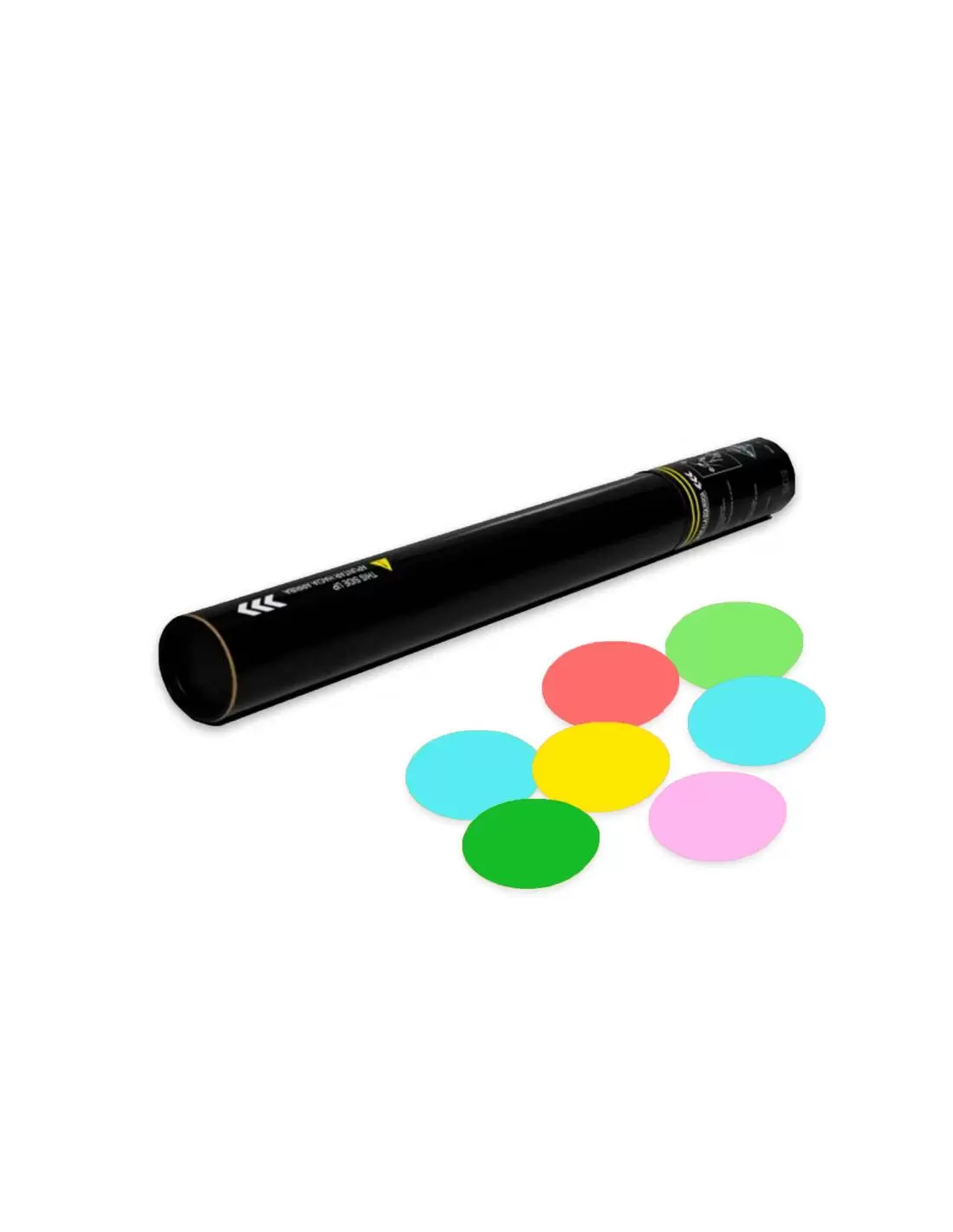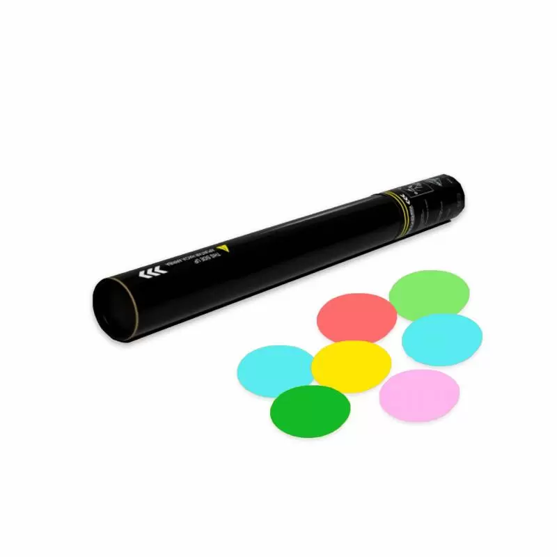 50 cm. handheld cannon loaded with confetti in the form of rounds. It is operated manually by turning the bottom of the tube.