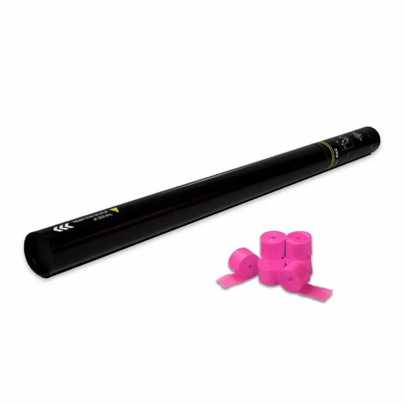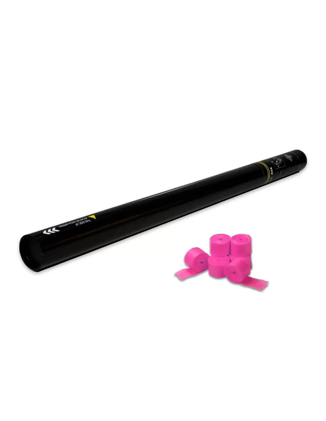 Lanciatore portatile da 80 cm caricato con stelle filanti da 1,5 cm x 10 m. Le stelle filanti con finitura in carta hanno una caduta più lenta e sono biodegradabili e ignifughe.