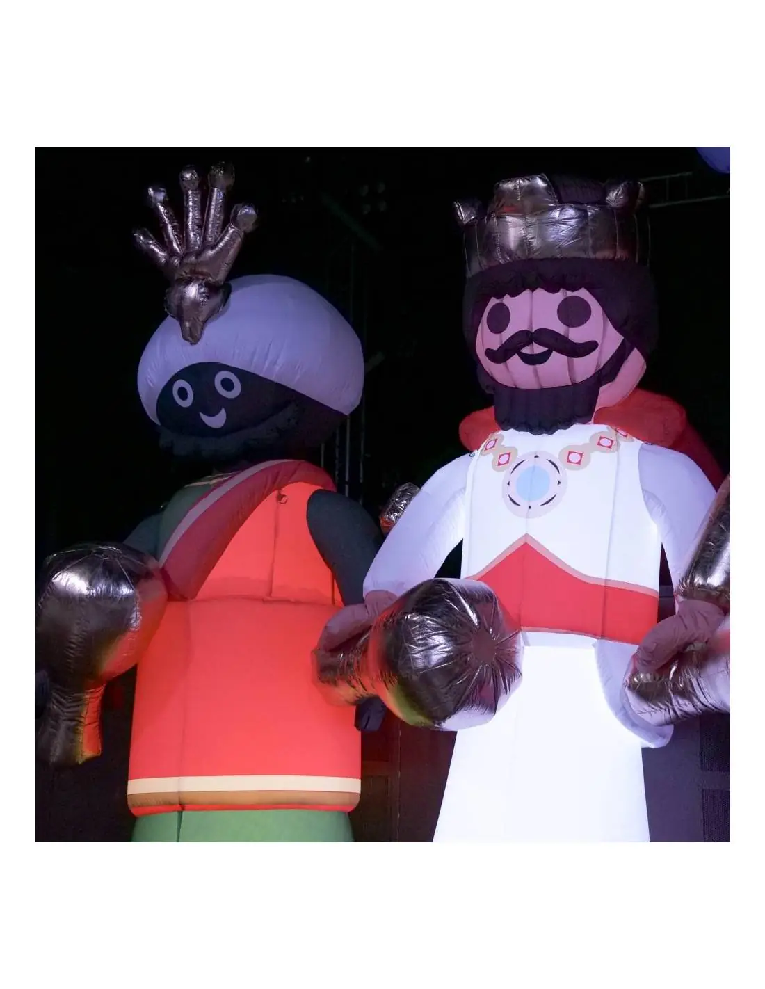Confezione da tre statuette gonfiabili a LED alte 3 metri raffiguranti i Re Magi: Melchiorre, Gaspare e Baldassarre. Perfetto per decorare diversi spazi o come elemento centrale di un carro allegorico. Ecco i tre Re Magi dall'Oriente!