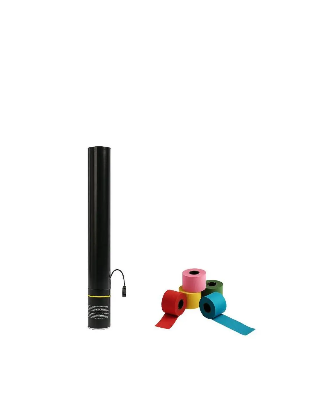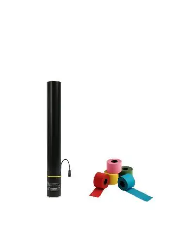 Lançador elétrico de 50 cm. carregado com flâmulas de 0,85 cm x 5 metros de comprimento. As flâmulas com acabamento em papel apresentam uma queda mais lenta em comparação com a queda do metálico, uma vez que pesa menos. Em vez disso, as flâmulas metálicas têm um acabamento brilhante esteticamente bonito.