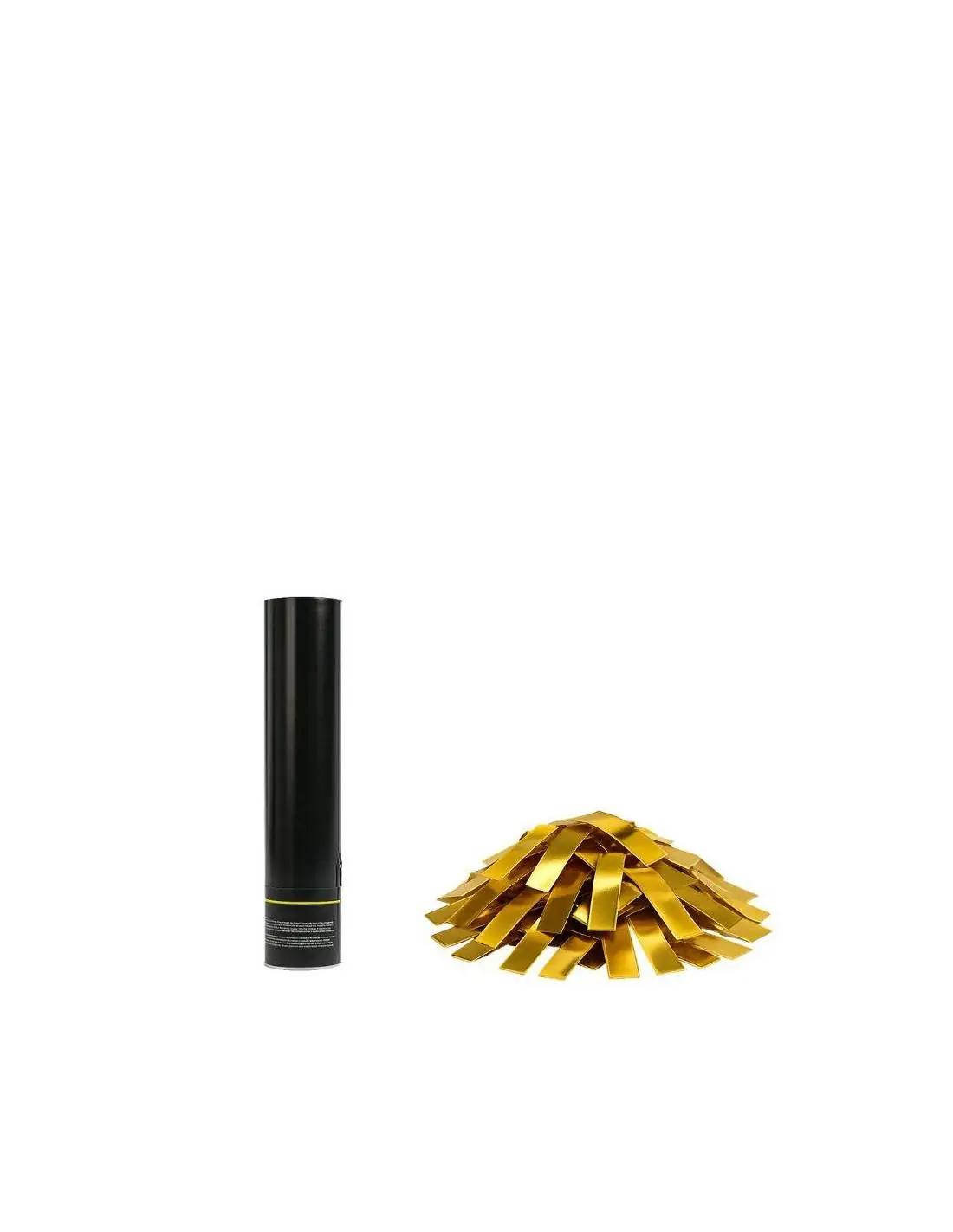 Canhão de confete elétrico de 30 cm. Os confetes incluídos metalizados, com um tamanho de 2 centímetros de largura e 5 de comprimento, além de poderem escolher entre uma ampla gama de cores. É operado manualmente girando a parte inferior do tubo.