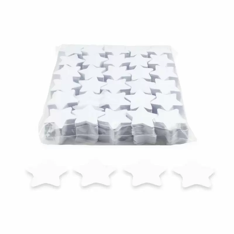 A queda dos estrelas de confete é muito lenta, uma vez que o material de papel de seda pesa muito pouco. Como importantes características de segurança, é um material profissional, pois é 100% retardante de fogo. Isso é algo a ser lembrado por razões de segurança.