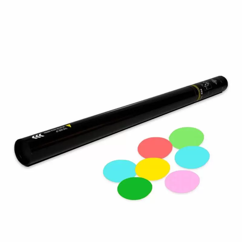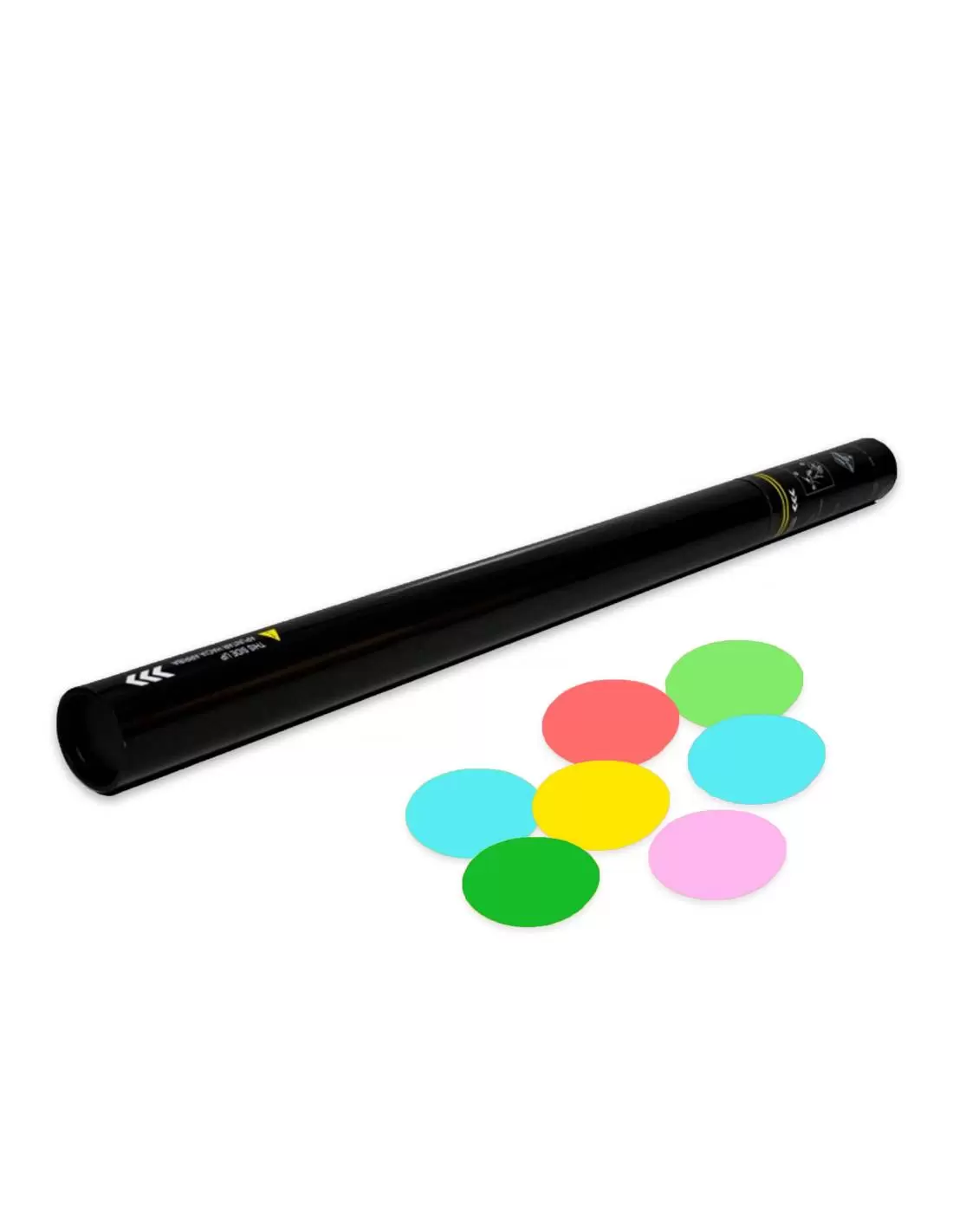 Lançador manual de 80 cm. carregado com confete rodada de papel e / ou metálico (disponível em cores diferentes). O confete no acabamento do papel tem uma queda mais lenta quando comparado com a queda do metálico, uma vez que pesa menos. Em vez disso, o confete metálico tem um acabamento brilhante esteticamente bonito.
