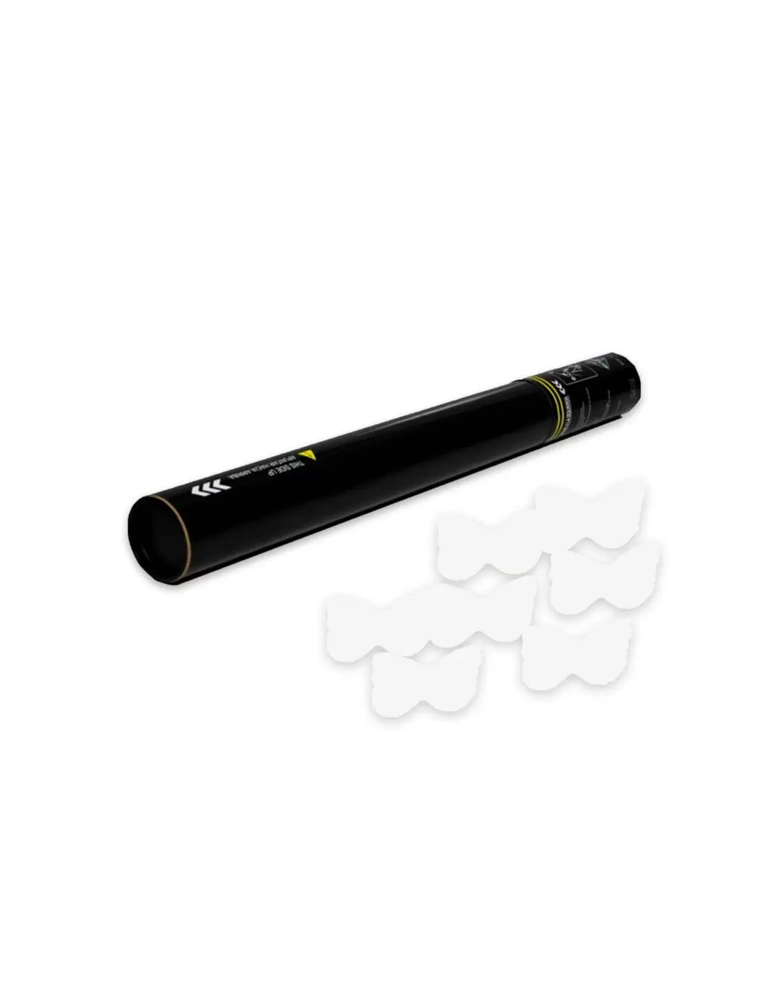 Canhão manual de 50 cm. carregado com confetes em forma de borboletas. É operado manualmente girando a parte inferior do tubo.